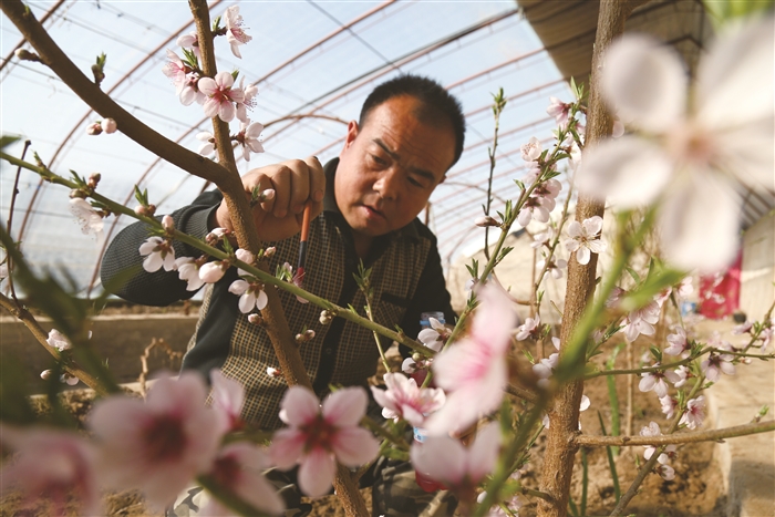 2月26日,甘肃酒泉敦煌市七里镇秦家湾村农民在温室中为桃花授粉。