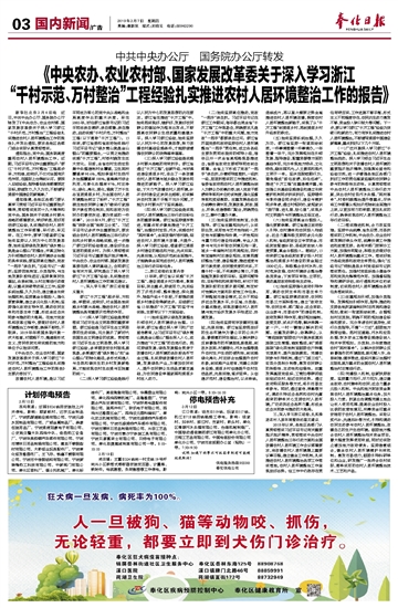 《中央农办、农业农村部、国家发展改革委关于深入学习浙江 “千村示范、万村整治”工程经验扎实推进农村人居环境整治工作的报告》