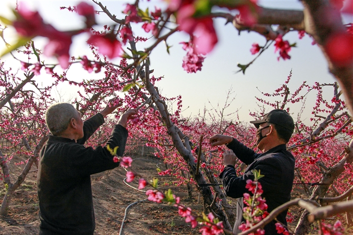 4月15日,河北唐山遵化市兴旺寨乡朝阳沟村村民在一处桃园忙碌。