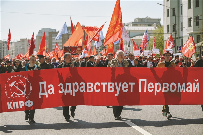 5月1日,在俄罗斯首都莫斯科,人们参加“五一”游行,庆祝“五一”国际劳动节。