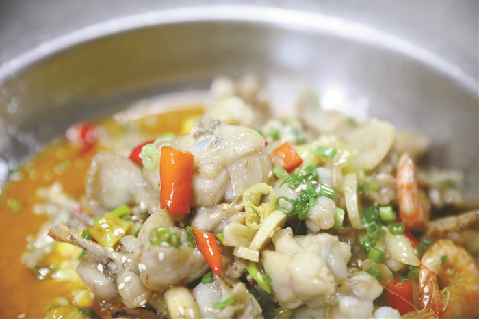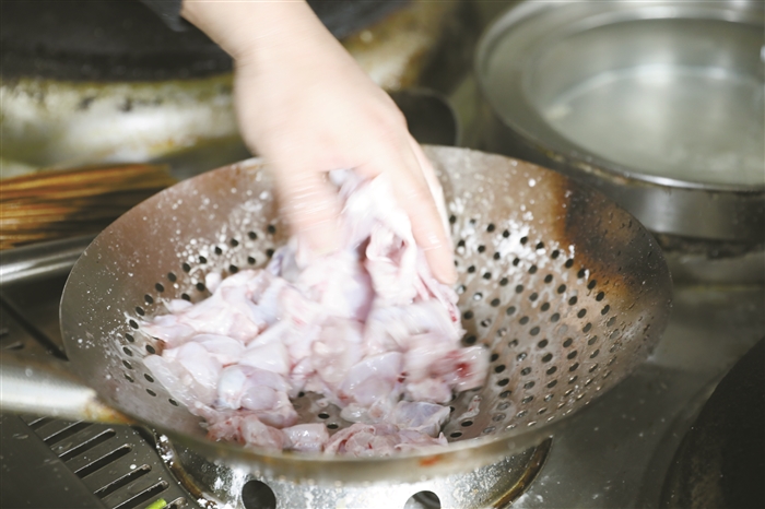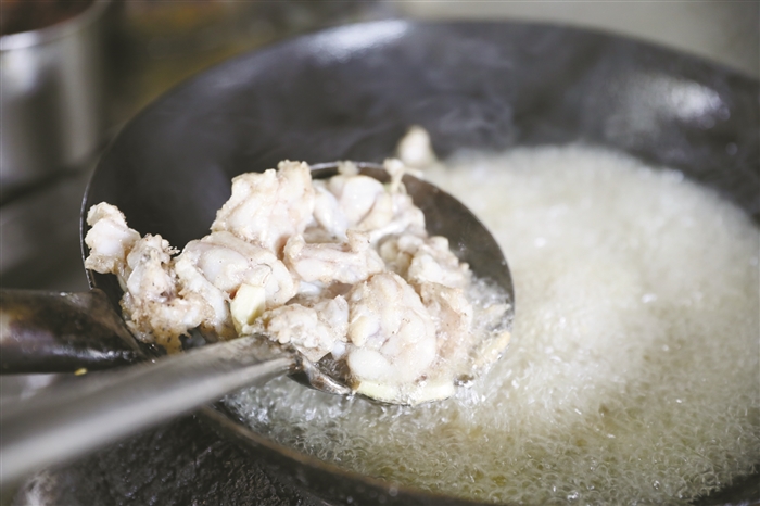 “这个油炸过的蛙肉既酥又嫩又入味,外皮又焦脆,肉质鲜嫩紧致有弹性,加了青红辣椒调味,鲜香滑嫩、微微辣让你的味蕾无法抗拒。很多人担心食用牛蛙会有寄生虫的问题,其实不然,正常牛蛙肉高温烹饪一定时间后,即可杀死它体内的寄生虫。”张欢表示,牛蛙肉是一种高蛋白、低脂肪、低胆固醇的健康食品,吃再多都不用担心会有三高风险,特别适合老人吃。另外,因其味甘、性平,几乎没有不适宜食用的人群,真是个天赐的食材。