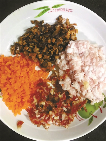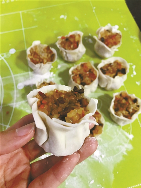 配料(参考分量:20个): 糯米馅:圆糯米300克,猪肉馅150克,腊肉35克,干香菇8朵,洋葱100克,蚝油30克,细砂糖20克,生抽25克,老抽20克,料酒15克,植物油30克。 烧卖皮:面粉(中筋)150克,开水75克。 制作过程: 1.首先将圆糯米淘洗干净以后,用清水浸泡一晚,使糯米充分吸水膨胀。 2.浸泡好的糯米沥干水,将它铺在蒸盘里(或者铺了屉布的蒸屉里),薄薄铺上一层。大火蒸25分钟左右,将糯米蒸熟。 3.锅大火烧热,倒入植物油。油热后加入切碎的洋葱丁,不断翻炒。 4.炒到洋葱呈现透明质感,加入猪肉馅,并继续翻炒,直到猪肉馅变色。 5.然后加入切成丁的腊肉、香菇,继续翻炒2分钟左右。最后,将蚝油、糖、生抽、老抽、料酒调成的调味汁加入进来,翻炒均匀。 6.锅中的调味汁煮沸后,关小火,加入之前蒸好的糯米。 7.不断翻炒,使糯米和锅中的其他材料充分炒匀关火,这样一份美味的糯米馅就制作好了。 8.接着就是包烧卖了!取大约35克糯米馅团成团,放在买来的面皮中间,捏起来。 9.把所有的烧卖都捏好,放在涂了油或者铺了屉布的蒸盘/蒸屉上。然后大火蒸8分钟左右即可。 网友“独木城林”制作