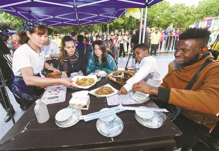 4月30日,工作人员在百花大会上为外国游客端来当地特色美食“牛八碗”。当日,浙江省杭州市富阳区龙门古镇举办“百花大会”,将乡村赏花采摘、住宿度假、文化消费等融合在一起,推动乡村“美丽经济”发展。