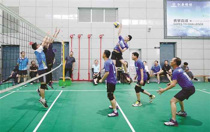 5月12日,庆祝新中国成立70周年·宁波市全民运动会选拔赛--“南海锦地杯”暨奉化区第三届“桃花杯”气排球联赛(男子组)在奉化气排球馆圆满落幕。来自全区各镇(街道)、社区等单位气排球俱乐部的23支队250余名业余气排球高手参加本届联赛。最终,贝特队荣获冠军,卫生队、兄弟联盟队分获亚军和季军。图为比赛现场。