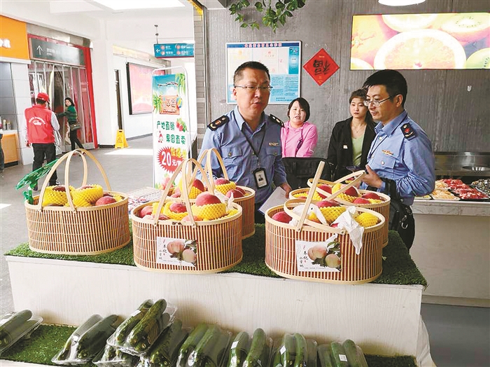 本报讯(通讯员 毛颐蔚)5月4日,区市场监管局城东监管所干部对辖区高速公路服务区进行节日市场检查,查获涉嫌侵权奉化水蜜桃地理证明标志的水蜜桃7筐约17.5公斤,无标签散装水蜜桃11公斤。