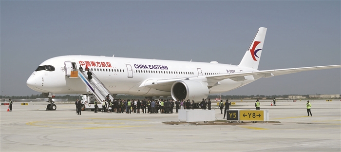 5月13日,在北京大兴国际机场,东方航空公司客机停靠在泊位。当日,4架大型客机依次在北京大兴国际机场跑道上平稳降落,标志着北京新机场完成首次真机验证。新华社发