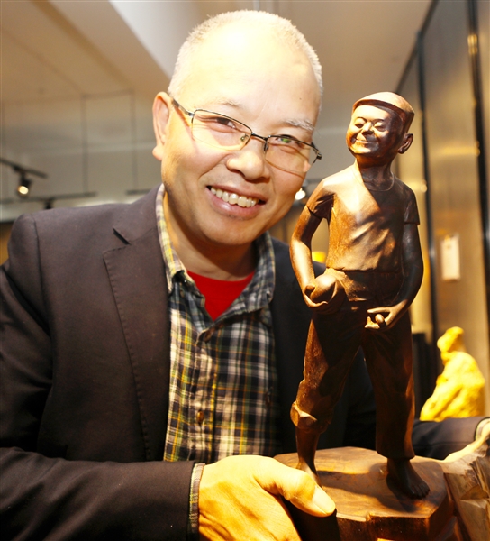 最近,大堰乡贤、宁波市工艺美术大师王力君的木雕作品“童年”荣获第十四届中国义乌文化产品交易博览会银奖。该作品反映了农村孩子天真烂漫极富童趣的生活,雕刻细腻生动,使人在欣赏之中体会到一股浓浓的乡愁。图为王力君在展示木雕作品“童年”。通讯员 毛节常 赵伊丽
