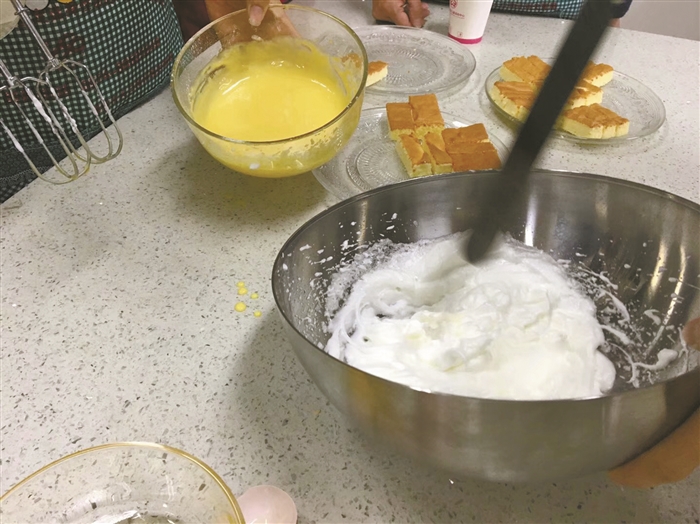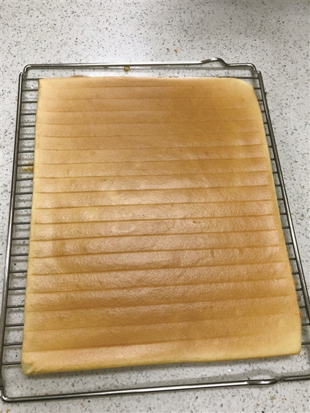 材料: 鸡蛋3个(蛋黄、蛋白分离) 糖36克 牛奶30克 油30克 低筋面粉30克 玉米淀粉15克 步骤: 1.鸡蛋提前从冰箱取出,将蛋清、蛋黄分离,低筋面粉加入玉米淀粉、泡打粉、盐混合均匀,过筛备用; 2.在蛋黄中加入白糖,搅打均匀,然后分3-4次加入色拉油、牛奶,搅打至蛋黄液体均匀、浓稠,没有油、水分离的现象; 3.轻轻加入面粉,快速切拌均匀,此时可以将烤箱预热到180度; 4.蛋清中可加入柠檬汁,用打蛋器打出鱼眼形的大泡,然后加入白糖,直到蛋白硬性发泡; 5.取出1/3的蛋清和之前拌好的蛋黄混合,用橡皮刮刀拌均匀,然后将混合好的面糊倒入蛋清中,迅速拌均匀; 6.立即倒入蛋糕模子中,放入烤箱中层,用180度上下火烘烤40分钟,烤好后取出立即倒扣,晾凉后即可脱模。 网友“木木”提供