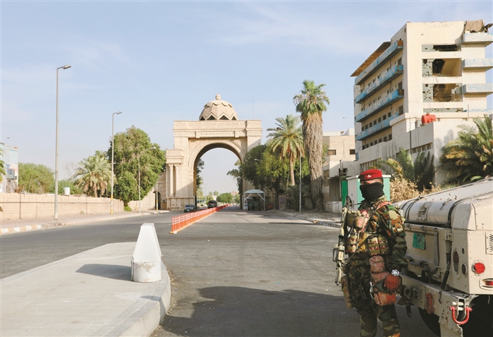 6月4日,在伊拉克首都巴格达,一名士兵在“绿区”入口警戒。