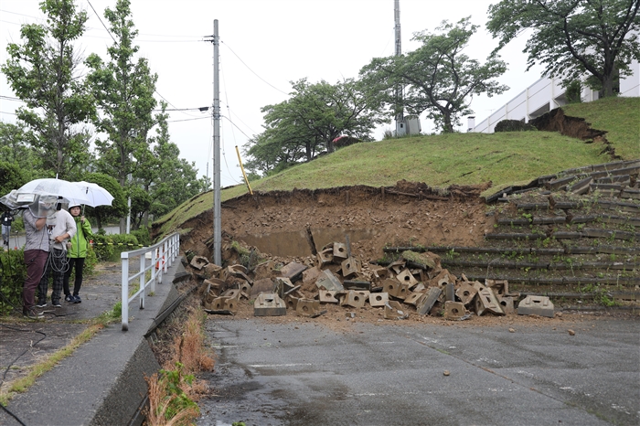 6月19日,在日本新潟县村上市,媒体记者拍摄一处断裂坍塌现场。