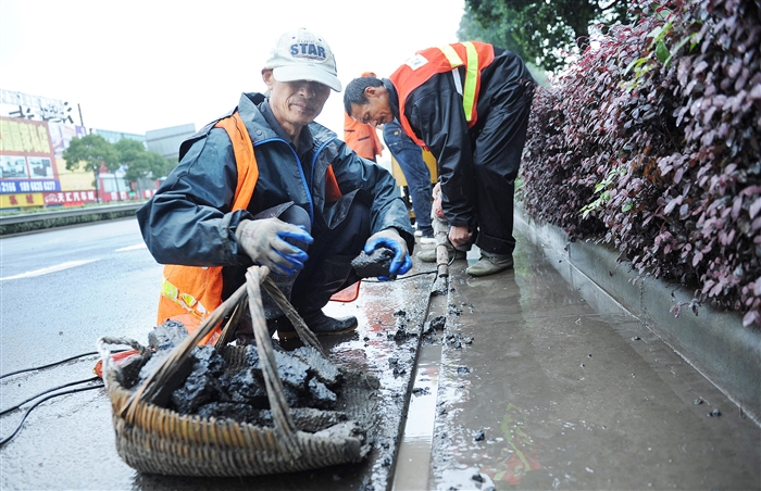 图为养护人员在南山路清理排水沟。