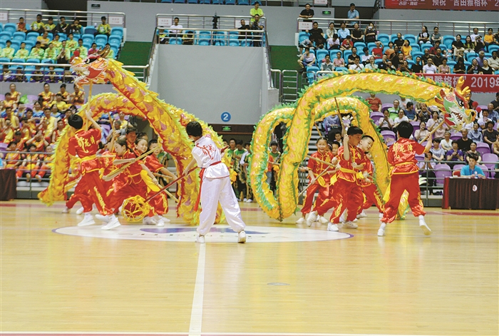 舞龙比赛中,选手们叠罗汉、螺旋跳龙……精彩的舞龙技艺赢得观众阵阵掌声。比赛将于11日落下帷幕。图为龙津实验队在比赛。
