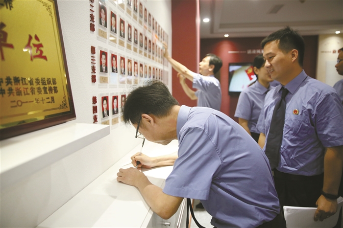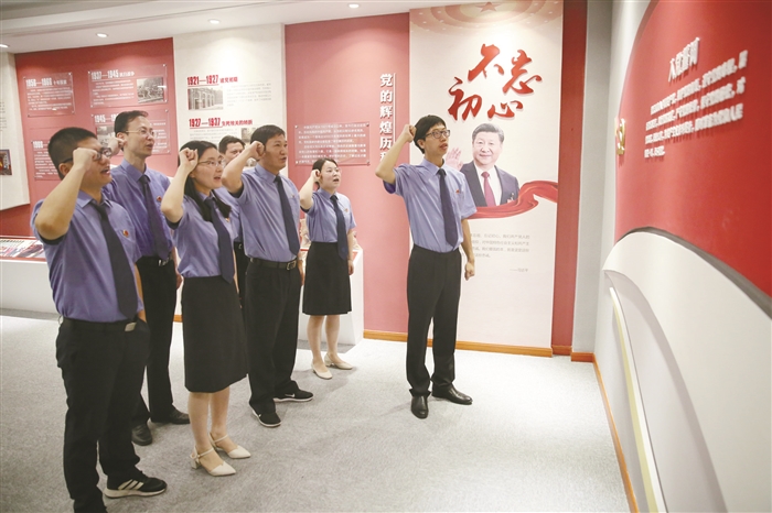开展党员承诺 本报讯(通讯员 林杰荣 杨刚)为纪念中国共产党建党98周年,推进机关党建工作,强化党员的先锋意识,7月1日上午,区人民检察院开展“学党史院史 重温入党誓词”主题党日活动,全院党员干部参加活动。 此次活动,该院以“不忘初心 重温入党誓词”和“牢记使命 学习党史院史”作为主题党日活动的主要学习内容。面对庄严的宣誓墙,该院全体党员高举右手,重温入党誓词,不断激发爱岗敬业、履行使命的决心和斗志,增强党员的荣誉感和使命感。宣誓完毕,每位党员还结合各自工作岗位,在活动现场进行党员承诺。随后,各支部组织党员干部参观了解区检察院院史荣誉馆,接受红色文化与廉洁文化的熏陶,增强教育针对性和实效性,铭记历史,不忘初心,以一幅幅真实的照片、一个个真实的故事,生动再现了奉化检察人廉洁自律、无私奉献的情景,进一步强化党员对党忠诚的理想信念和不忘初心、牢记使命、履职尽责、甘于奉献的担当意识。 通过参观学习,该院党员干部纷纷表示,党史和院史留给他们的宝贵精神财富永远值得铭记和传承,他们要做红色精神的坚定信仰者、积极传承者、忠诚实践者。 重温入党誓词