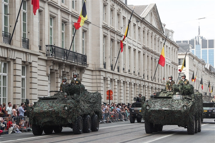 7月21日,在比利时布鲁塞尔,军人驾驶军事车辆参加比利时国庆阅兵式。