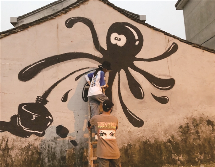 本报讯(记者 景小芳 通讯员 赵帅)近日,来自宁波财经学院环境设计专业的准大三、大四学生,来到莼湖镇桐蕉司村,结合所学专业知识美化村庄环境。 此次“创意点亮乡村”行动是市委宣传部和市教育局主办,主要包括村容村貌的提升、村庄公共场所的设计改造、美丽庭院的改造、村VI的设计等。 大学生们基于原有的墙面环境,利用电线、水管等制作了“喝水的小老鼠”“浇水的老爷爷”“绿色出行”“垃圾分类”等一系列趣味墙绘。接下来,他们还将利用木头、瓦片、竹子、啤酒瓶等废弃材料,动员村民参与制作墙面背景以及景观小品,动手改变村容村貌。 图为学生绘制“墨水瓶里的章鱼”。