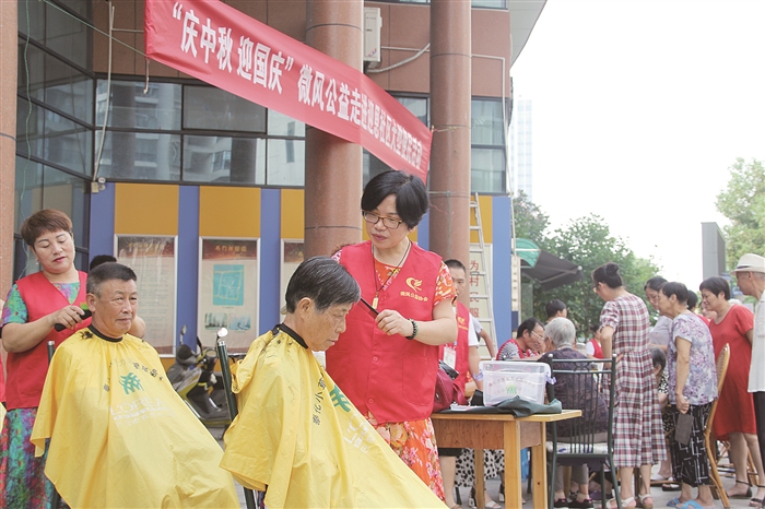 昨天上午,岳林街道迎恩社区联合宁波微风公益协会开展“迎中秋 庆国庆”大型便民活动。活动现场,志愿者们为社区200多位居民提供了理发、磨刀、按摩、维修家电等服务。
