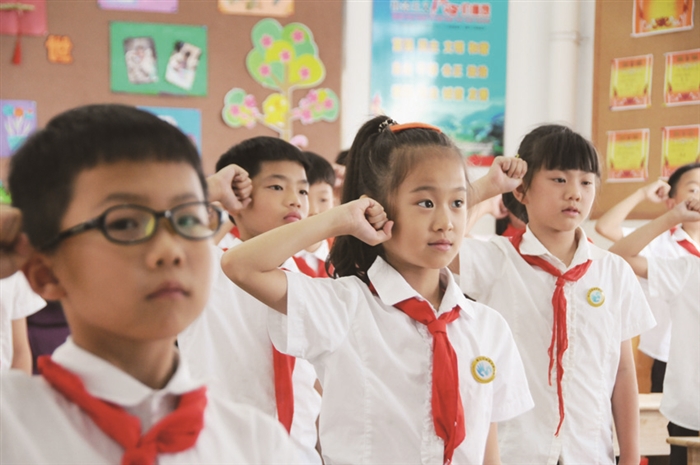 通讯员 严琳榕 为庆祝建队70周年纪念日,进一步继承和弘扬的光荣传统,动员和引导广大少先队员以实际行动深入学习贯彻习近平新时代中国特色社会主义思想和党的十九大精神,加强对少先队员的教育引导,培育他们对党,对祖国的深切感情,帮助他们不忘初心、努力奋斗、快乐成长,近日,新城实验小学特开展少先队员庆祝建队70周年活动。 学校利用国旗下讲话、红领巾广播对全体学生进行少先队知识宣传教育。班队课上,各中队辅导员老师带领学生开展了队学习活动,观看队知识宣传片,同学们目不转睛得盯着屏幕,认真学习队知识。学校大队部还按照年段不同设计了不同的环节。其中一年级小朋友学唱《中国少年先锋队队歌》,二年级学生在辅导员老师的指导下学习如何规范戴红领巾。三四年级的学生重温誓词,规范敬队礼、呼号。五六年级则是开展“少先队知识我都会”知识竞赛,班级选拔出优秀学生再参加学校少先队知识竞赛。 大队部也趁着这个特殊的时期吸收了各班优秀的少先队员加入大队委行列,他们通过班级竞选,学校进行第二届红领巾理事会竞演,成功加入这个大家庭。希望他们能在这个岗位中发挥自己的才干,为学校、班级做出自己的贡献。 通过本次建队节系列活动,新城学子对少先队更加了解,也让新城学子成为更加规范的少先队员,将规范意识时刻牢记于心。