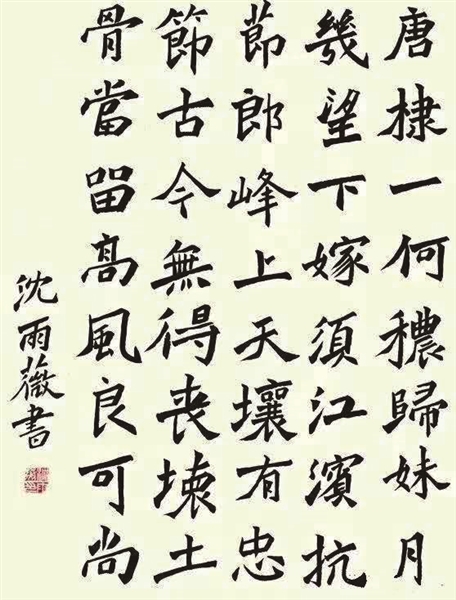 沈雨薇小记者的魏碑作品,结字宽博,写出了气势。整体来看,作品创作取法较杂,未用一种手法统一起来,如“骨、当”等字取自苏东坡,“节、望”等字有魏碑墓志的写法,希望今后在集字创作中,取法相近的经典法帖,尽量做到作品的统一、和谐。