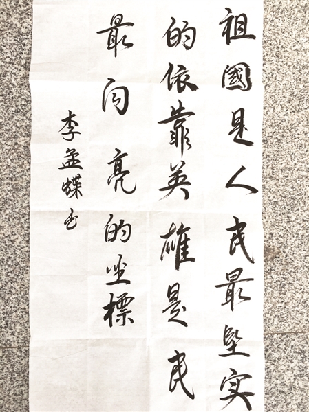 李孟蝶小记者的行书作品用笔率意轻松,但取法不明显,一些字繁简混用,不严谨。我们从临摹走向创作的过程中,可以先进行集字创作,每个字争取取法经典,有来源、有出处,保证字法、文义的正确,整幅作品的章法布局、落款的位置也值得商榷,希望今后加强经典法帖的深入临摹,再接再厉!