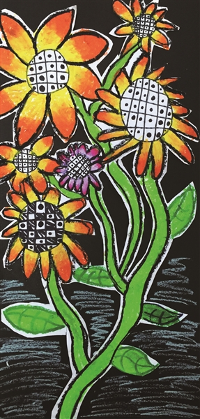 向日葵的颜色鲜艳热烈,花朵的结构美丽鲜明,它代表着生机与活力,热情与快乐,小作者运用了油画棒来表示,而油画棒的色彩厚重艳丽,用来体现向日葵再合适不过了。油画棒色彩的渐变与艳丽,以及长长的竖构图带给画面的视觉张力。