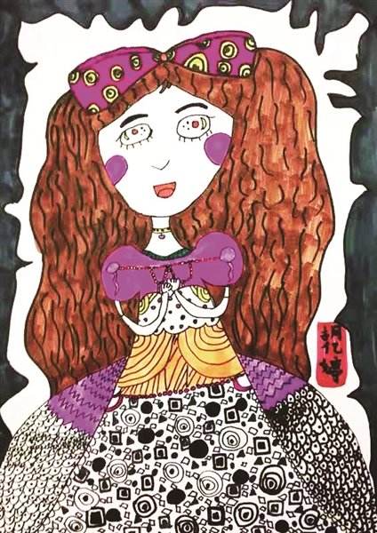 爱丽丝梦游仙境的故事深受孩子们和大人的喜欢,小作者用自己的绘画风格,在保持人物鲜明形象特征的基础上,进行丰富细腻的线条装饰,让画面充满了线条的美和平面的装饰感。疏密的对比、块面与线条的对比,都非常具有美感,也可以先整体再进行细节的丰富,用流畅的曲线表现出头发的质感,同时在人物的服装上,我们可以主观地进行丰富,而在裙摆的装饰上,通过在不同的线条区域里添加丰富的花纹,将简单的图案和线条进行丰富排列和变化,形成了美丽的装饰感。