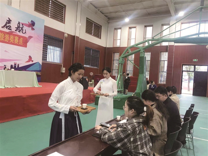 本报讯(记者 喻兴萍 通讯员 乌雯雯)昨天上午,为期3天的2019年全区职业教育学生技能大赛拉开帷幕,期间,区职教中心和工贸旅游学校两所学校的550名学生将参加电气控制线路安装与调试、机电一体化设备组装与调试等42个比赛项目。 昨天上午,在职教中心体育馆楼下的实训工厂里,高三学生田子渌正和搭档一起组装一条模拟的流水线设备。只见她动作娴熟地搭着电线、拧着螺丝,整个操作紧张忙碌却有条理有次序。比赛时间还未过半,她已经完成了设备组装近60%的工序。 在工贸旅游学校的中餐宴会摆台赛场,评委老师正拿着尺子认真丈量着盘子与盘子之间的距离,查看是否摆放均匀。此外,还对筷尾和盘子与餐桌边缘之间的距离也进行测量,力求整齐美观。 据悉,此次技能大赛由区教育局、区人力社保局和区总工会联合举办,旨在展示我区中等职业教育成果和学生风采,进一步提升职业学校学生专业技能水平和实际操作能力,从而更好地办好职业教育,为我区经济转型升级做好人才支撑。本次获得比赛优秀的选手将代表奉化参加宁波市级以上级别的职业教育学生技能大赛。 中华茶艺比赛现场