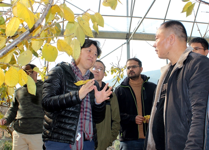12月14日,上海交通大学农业与生物学院教授张才喜带领学院的博士后、博士以及巴基斯坦留学生等人员组成的课题团队,来到溪口镇岩坑村车厘子基地,调研该村的车厘子产业,并向村民传授车厘子品种培育、病虫害防治和修剪技术要领。