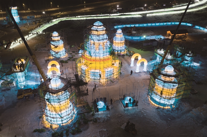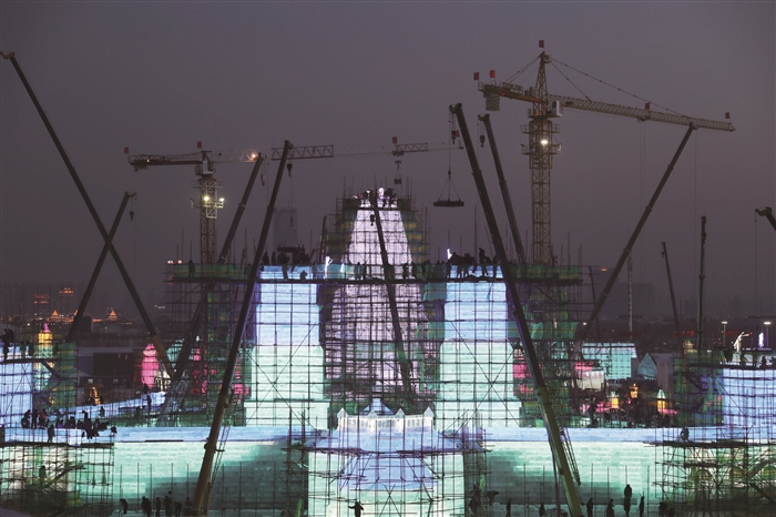 近日,以“冰雪共融 欢乐同行”为主题的第二十一届哈尔滨冰雪大世界园区正在加紧施工。本届冰雪大世界占地面积60万平方米,将用20多万立方米的冰雪打造出一座“冰雪梦工厂”。