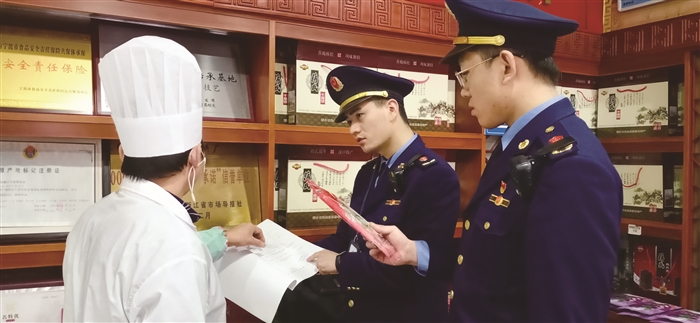临近春节,为使广大游客玩得开心、吃得放心,区市场监督管理局溪口监管所严把关口,于近日开展节日食品安全专项整治行动。重点对溪口旅游景区及周边的千层饼作坊进行检查,针对性地检查从业人员的健康证、作坊的环境卫生、制饼人员的操作规范及着装、千层饼的出厂检验情况以及产品外包装标签标识等内容。图为溪口市场监管所干部在蒋氏千层饼专卖店查看千层饼的出厂检验报告和产品外包装上地理标志标识情况。