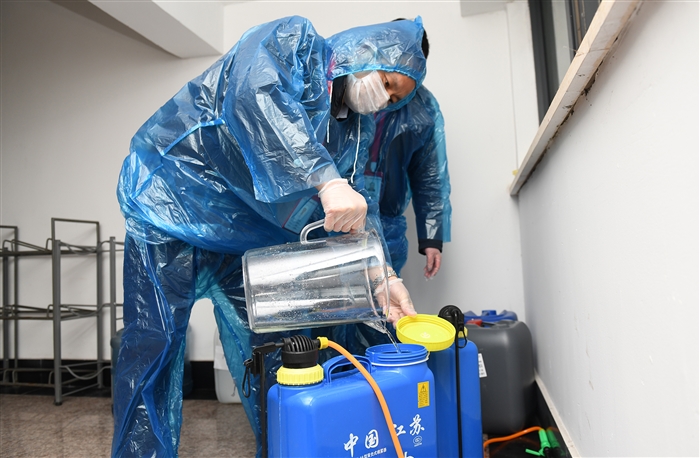 位于岳林街道的宁波霍科电器有限公司于2月13日复工,目前已有50%员工返岗。在有序复工的同时,公司扎实做好各项防控措施,确保安全生产。 记者了解到,由于外来员工较多,公司后勤人员在春节期间就已着手消毒水、口罩等防疫物资的采购,落实好返奉员工的健康观察用房。 复工以来,公司除了在厂区各个醒目位置贴上防疫知识和相关要求外,还采取了员工测量体温后上岗,每天两次对厂区消杀、使用一次性餐具分开用餐、广播防疫注意点、减少公共区域使用、取消电梯使用和指纹考勤等各项措施。 图为工作人员正在准备消毒水对厂区进行消杀。 记者 王红雨 通讯员 吴晓琳