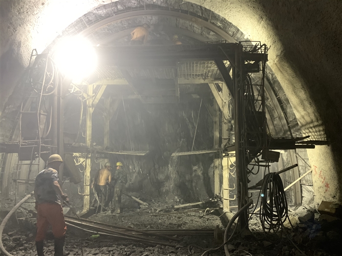 2月14日,中铁八局中老铁路项目部工人在老挝琅勃拉邦附近的隧道里施工。