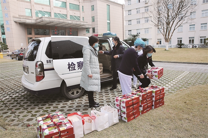 本报讯(通讯员 林杰荣)“三八”节当天,区检察院妇委会组织女干警走访慰问了区人民医院医共体感染科、发热门诊等科室的医护人员。女干警们对医护人员在抗击疫情中的顽强拼搏和无私奉献表示敬佩,并为她们送上相关物资,转达区检察院的节日问候和祝福,希望她们在勇战病魔之时注意自身安全,同时也向她们了解最新的疫情防控情况。 除走访一线医护人员外,在这个特殊的节日里,区检察院的许多巾帼志愿者放弃休息,依旧投身在疫情防控的前线,自发参与各个社区的疫情防控志愿服务以及助力我区企业复工复产。 节日当天,辖区内不少小区卡点、企业园区、巡逻路段还能见到区检察院巾帼志愿者的身影。她们或是排查进出车辆,为过往居民测量体温、登记信息;或是劝导疏散聚集聊天的居民,劝导未戴口罩者及时戴好口罩;或是拿着喇叭走街串巷地宣传防疫知识,并张贴相关告示和海报;或是在复工企业检查防疫措施,为企业人员传达解读政府的相关惠企政策。 这些,只是区检察院巾帼志愿者在疫情防控工作中的一个缩影。自1月底以来,区检察院已累计派出35名女干警参与疫情防控志愿服务,平均每天参加志愿服务时间9—10小时,共计帮扶企业(项目)52家(个)。 区检察院妇委会慰问医护人员