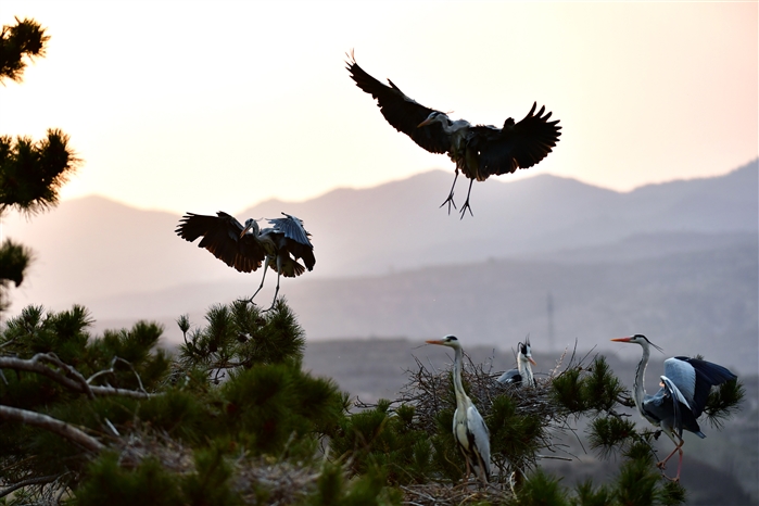 春日,大批苍鹭在山西省吕梁市方山县积翠乡的树林之中飞舞嬉戏,构成一幅幅和谐生态画卷。