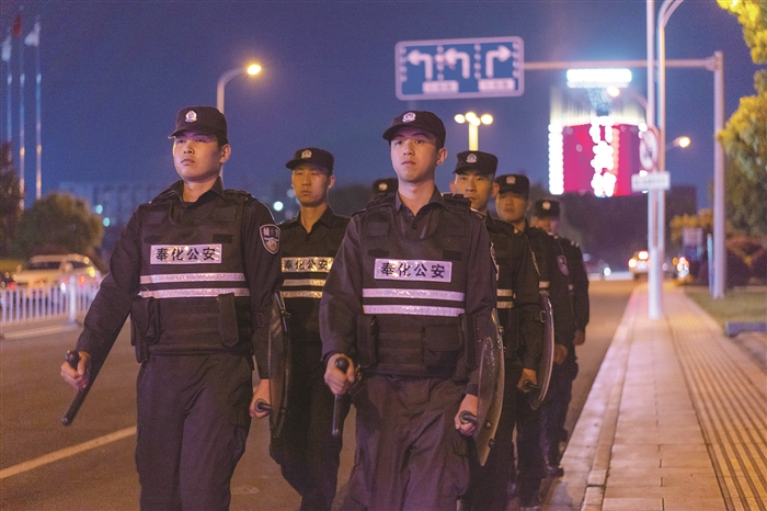 图为昨晚8时许,巡特警队员在桥东岸路体育馆附近巡逻。