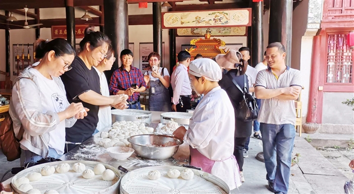 本报讯(通讯员 徐腾辉 赵恭艳)连日来,一批批游客慕名来到萧王庙街道滕头村、青云村,他们在滕头“户外天空”乐园畅玩,在美食园品尝农家风味,在青云古村品味古宅风情。 5月24日,裘村镇总工会组织一批企业职工到萧王庙参加欢乐家乡游活动,在参观青云古村古宅之余,观看油包制作的各个环节:调料、配比、和面、揉团、蒸煮等。 “在街道打造全域旅游示范区的规划中,青云村的定位是集古村游览观光和农家深度体验、耕读研学于一体的历史文化展示区。游览古村让游客体会到保护文物、传承文化的重要意义,而亲身体验农家生活,则让游客享受片刻的舒适和忘我。” 据街道旅游办一名工作人员介绍,目前以滕头村为代表的“绿色经济观赏区”同青云村的“历史文化展示区”已初步形成旅游内容、风景、特色等方面的互补和联动,构成一条产品多元化、层次多样化的精品旅游路线,一幅“让城市更向往”的乡村画卷正在这个富有活力的土地上缓缓铺开。 图为游客在青云村观看油包制作流程。