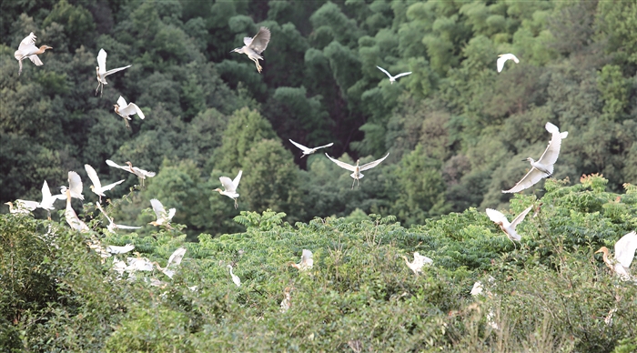 成群的白鹭在山谷飞翔,傍晚它们又互相呼唤着栖息在树梢、竹林和花木丛中……近年来,大堰镇深入打造“乡愁小镇、云上大堰”,生态环境越来越好。图为翱翔在大堰村细地畈花木上方的白鹭群。
