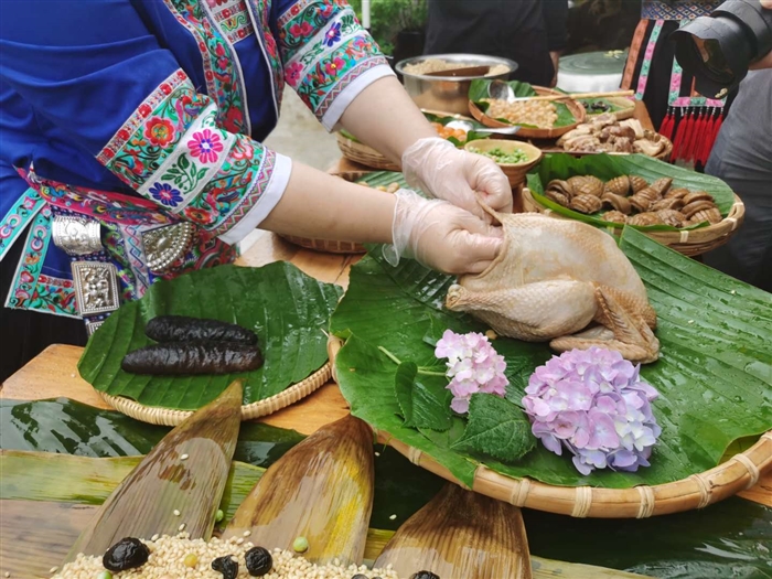 端午临近,锦屏街道溪岙村和尚岙自然村的广西媳妇欧春霞结合壮族特色和奉化当地食材,在自己的农家乐推出了巨大粽——全鸡粽。整个粽子包含村民饲养的土鸡、板栗、咸蛋黄、香菇、鲍鱼、干贝、海参等10多种食材。经过10多个小时的烧制,粽子切开后全鸡已经骨肉分离,部分食材融化后全部渗透进了鸡肉和糯米里,吃一口,咸、香、鲜、甜瞬间滋润了味蕾,唇齿留香。记者 袁冰露