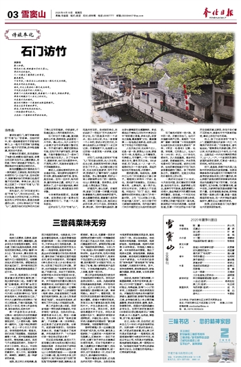 原杰 莼菜又名蒪菜、马蹄菜、湖菜等,也有称水葵的,属睡莲科,是多年生水生宿根草本植物。早在先秦,它就已经是知名蔬菜,因其性纯而易生得名。《诗经·鲁颂·泮水》云:“思乐泮水,薄采其茆(莼菜)”。那时,它在长江黄河流域的大江小湖里很常见,但随着后世水质日渐污染,便很难在自然水域见到了。其中就有我区的莼湖街道,其莼菜随莼湖湮没了近千年。 1999年,莼菜被列入《中国国家重点保护野生植物(第一批)》(保护级别Ⅰ级)。别看它“颜值”没睡莲高,却可谓“金枝玉叶”——人工栽种的莼菜是江南名产,还出口日本、韩国等地。唐代大诗人白居易《偶吟》云:“犹有鲈鱼莼菜兴,来春或拟往江东。”宋代大文豪苏轼也有词赞曰:“若问三吴胜事,不唯千里莼羹。”而我在几十年间,有幸3次品尝莼菜,皆印象深刻,回味无穷…… 第一次品尝在30多年前。记得与一起在杭州开会的同事游西湖,路过湖边大名鼎鼎的楼外楼饭店时,二人顿来兴趣:难得来一趟杭州,又是个桃红柳绿的春天,该上一次心仪已久的饭店,尝尝西湖特色菜!落座后,我们共选了西湖醋鱼、西湖莼菜羹等5个菜,其中莼菜羹是我单独点的。等莼菜羹上桌后,我用勺子去捞里面的菜叶,发现叶子形状十分奇特。两头尖,中间向内卷起来,看上去像是还未展开的嫩茶叶。送入口中,感觉酸酸的、滑滑的、嫩嫩的,是一种新奇的味道。 诚然,我之所以点莼菜羹,是因为莼湖的缘故。也就是说,口中品尝着西湖莼菜,心里却想着莼湖街道的莼菜……我小时候在莼湖读书,大学毕业后又在那里执教。其间,我曾对莼湖地名的来历发生兴趣——莼湖有湖,湖里有莼菜。于是业余时间踩着自行车四处寻找遗迹,最终找到了街道东五里的莼湖岙村,断定与莼湖有关。同时翻阅《奉化县志》《忠义乡志》等地方史料,也发现了相应的文字记载。原来,古时莼湖是个由海湾形成的泻湖,广约数千亩。后由于不断淤积,到南宋绍兴年间尚有湖面800亩,并盛产莼菜——“莼湖”之名由此而来。关于莼湖存世的最后记载当在清康熙年间,此时湖面只剩下不到半亩。据说唐代时,湖边一位看鸭癞头(另一说为“鲁生”)上京城献宝(莼菜)被杀,后皇宫娘娘吃了他遗留的莼菜而病除,皇上良心发现便赐名“莼湖”。传说虽有些离奇,却寄托了历代当地人对莼湖的念想。 第二次品尝已是3年前。因老家莼湖一带的亲戚来看望我,中饭安排在一家饭店。当我点好冷盆、荤素热菜与点心后,想加一份羹汤,发现菜单上标有“莼菜豆腐羹”,不由眼睛一亮(后来得知,全区就选了这家饭店试推,也够巧,或者说够有缘的)。在向服务员确认后,我毫不犹豫点了莼菜羹,并向亲戚卖关子:“今天给你们尝一尝没尝过的家乡菜!” 而这回点莼菜羹,是因为不久前刚看过《奉化电视台》题为《我区莼湖采莼菜 失传多年终于试种成功》的新闻。该新闻首先呈现一个让人心神荡漾的画面——一名采摘女工划着小船,拨开浮在水面上的莼菜叶片,轻巧地将水面下如同“贵妃指”的莼菜嫩叶挑起,娴熟地从茎部掐断。看上去,包裹着一层胶状透明物质的嫩叶如同一件精雕细琢的水晶工艺品出水而来,在她手上闪着晶莹的光芒。新闻同时配合解说:“莼湖因莼菜而得名。今年3月下旬,莼湖从杭州建德引进莼菜苗种试种。经多次试种,在杭州西湖莼菜推广中心老师指导下,莼菜终于在这里的山水间扎根生长。”紧接着,我所喜欢的“乡间超市”栏目,也推出了吆喝、推介新鲜莼菜产品的节目。千年莼菜重获新生,不由让人惊喜,很想一尝为快。 第三次品尝莼菜是因为参加关于莼湖莼菜的专题采风,因而此次品尝比较深入、全面。先是到新建的莼菜基地现场考察,并听取相关介绍。这片16亩的水田,位于莼湖街道西八里舍辋水库上游,背倚雨施山,高低不一,错落有致,因而可利用自然落差引清纯明亮的山溪水灌溉。细看水中漂浮的莼菜,发现它从地下葡萄茎处萌发须根和叶片,并生出数条分枝,形成丛生状水中茎,再生分枝。其深绿色椭圆形叶子互生,浮在水面或潜伏在水下,嫩茎和叶背有胶状透明物质,开暗红色小茎花。一如宋诗人杨蟠诗句所描绘的“鹤生嫩顶浮新紫,龙脱香髯带旧涎。” 接待的管理人员一边说着这里的莼菜“纯天然,无污染,擦在身上很舒服。”一边真的将一片莼菜叶抹在胳膊上,反复涂抹……我忍不住好奇,也蹲下身子伸手去采摘靠近田埂的莼菜。可由于莼菜嫩叶太滑,又是藏在水中飘忽的藤下,因此老是抓不住。最后弯腰凝神,猛一伸手,好不容易揪住一叶,可由于使劲过大,差点翻到田沟里去。 稍后午餐是品尝莼菜,这也是此次采风的一项任务。当然在实地与莼菜零距离接触后再品尝,感觉自然不一样。综合各地做法,传统莼菜共有莼菜羹、凉拌莼菜、莼菜鲈鱼烩、莼菜银鱼羹、莼菜牛肉粥等10余种做法。而莼湖人推陈出新,与本地特色食材搭配,推出了莼菜米豆腐、鲈鱼莼菜羹、跳跳鱼莼菜羹、高汤莼菜及青蟹莼菜汤等10余个新菜品。今天供我们品尝的“凉拌莼菜”“葱油莼菜”和“鲈鱼莼菜羹”,无疑具有代表性。其中,凉拌油滑清爽,葱油翠绿浓烈,鲈鱼羹则圆融、鲜美、滑嫩,令共席者啧啧称赞。 说实话,莼菜除了颜色鲜嫩,口感圆融滑嫩,本身并没有味道,是一种人们口中的“百搭菜”。与其他食材配合,相得益彰,取得“1+1>2”的奇效,上面提到的一些名菜便是如此。