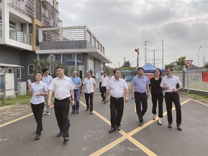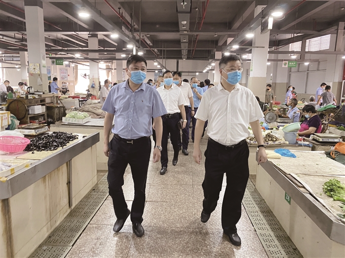 ▲江口街道人大工委主任江佩阳(前排右一)带领相关部门负责人在菜场检查食品安全情况。