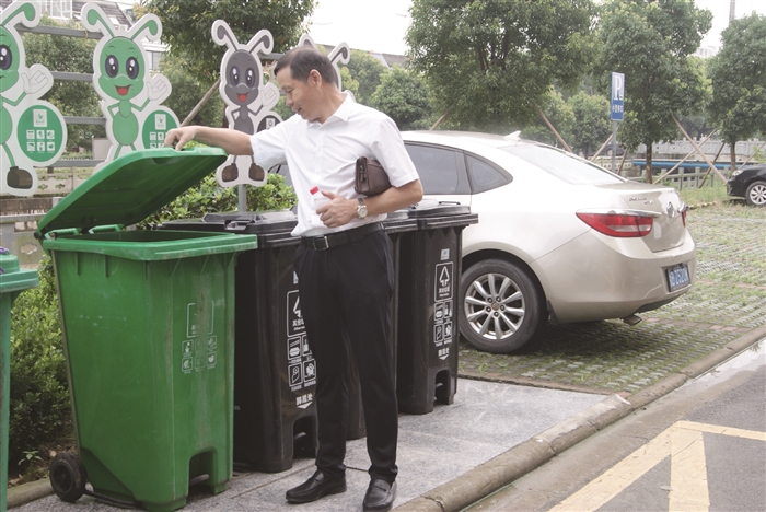 ▶王溆浦村党支部书记王安国检查垃圾分类是否到位。