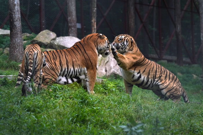7月29日,在横道河子东北虎林园散放区,东北虎在打闹。