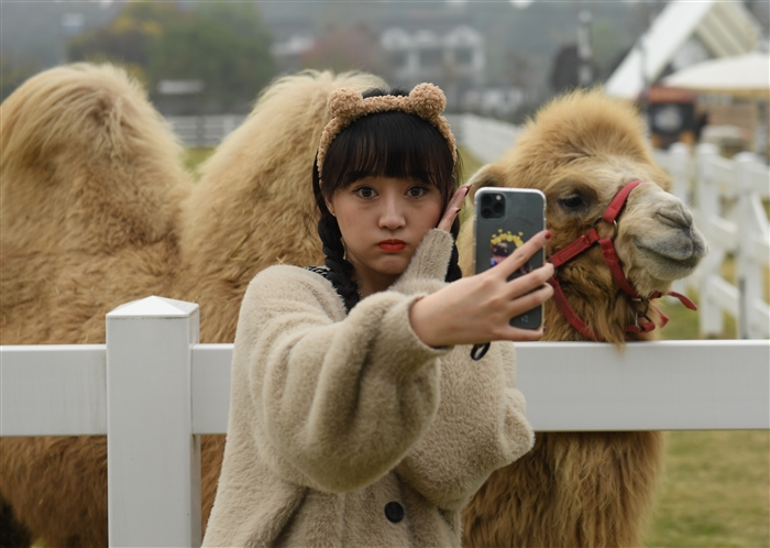 11月17日,一名女孩在菰城村一家动物农场和骆驼合影。