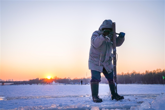 12月7日,工人在松花江哈尔滨段江面上采冰。