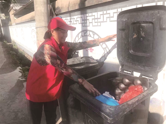 图为上汪村志愿者正在“桶边值守”,督导村民正确投放生活垃圾。