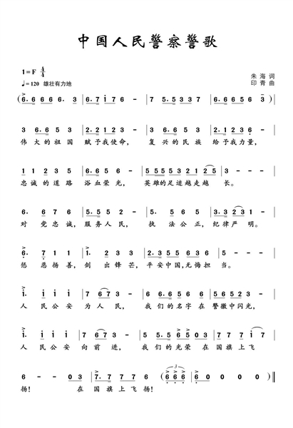 《中国人民警察警歌》由朱海作词、印青作曲,歌曲时代特色鲜明,警察职业特征突出,旋律刚劲有力,情感饱满真挚,反映了人民警察忠诚履职、昂扬向上的精神风貌和家国情怀,体现了新时期人民警察的理想信念和价值追求。