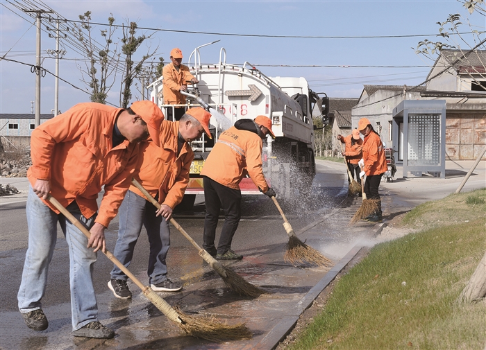 图为养护工人正在清扫奉钱线白杜段隔离带。