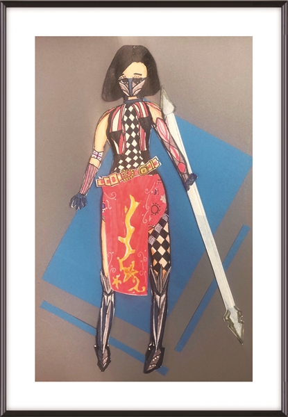 大家好,我是小夏米胡曦月,今年7岁啦,读幼儿园大班。这是我设计的一个带着惊讶表情的女孩子,她瞪着大眼睛,张开了嘴巴,好像看到了令人不可思议的东西。我用黄紫色调来表现她的情绪,粉紫线条图形的组合来突出人物。一起来欣赏我的作品吧! 作品展示 《多变的表情》 老师评语 曦月小朋友在幼儿园大班阶段能有这么好的艺术表现力非常难得。这幅作品构图饱满,造型设计独具匠心、表情夸张生动,在色彩搭配上更是有自己的心得,很好地突出了人物的情绪,有极强的表现力。 艺术知识链接 这幅作品从毕加索不同风格时期作品入手,学习了解情绪与色彩的表达。运用夸张的表情和色彩搭配,以点彩和线描方式处理塑造人物情绪。 自我介绍 大家好,我是小夏米王蓓瑶,今年9岁,爱唱爱跳,爱走T台,最爱画画。成为一名顶级的服装设计师一直是我的梦想。这是我的服装设计首秀——盔甲设计,希望大家喜欢哦! 作品展示 《服装上的图案设计》 老师评语 蓓瑶小朋友的作品风格细腻,注重细节。在设计上有自己独特的想法,有设计师的潜质。此作品人物动态比例把握到位,图案的组织和色彩的运用都很好地塑造了主角的身份特征。继续努力! 艺术知识链接 欣赏学习画家埃舍尔的艺术作品,运用图案的重复与节奏,设计一款独特的士兵服饰。