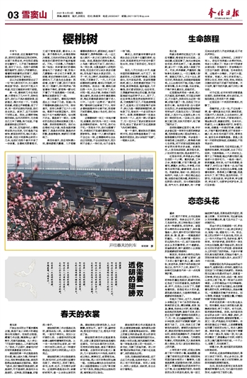 潘玉毅 不独尘世间的女子喜欢漂亮衣裳,就连不食人间烟火的春姑娘也有此雅好。在她的衣柜里,藏着几件衣裳,精美得让人爱不释手,而春风是裁缝。古人诗云:“不知细叶谁裁出,二月春风似剪刀。”其实,不止细叶,春暖花开时所有的美景都是它的杰作。 春姑娘的第一件衣裳是绿色的长裙,青山绿水为摆,茂林修竹为边,苍松翠柏都是点缀,绿色的杨柳丝绦是缝织衣裳的线。裙袂飞扬间,我们看到的草是绿的,菜是绿的,竹子是绿的,就连河水也是绿的。这种绿,层层叠叠,好像深入骨子。 春姑娘的第二件衣裳是红色的,颜色由浅入深,由隐约到鲜明,一直在不停变化,宛如少女怀春的心思。从暗香浮动的红梅到漫山遍野咧着嘴笑的杜鹃,从一朵一朵开放的仙客来,到一树一树开放的山桃花,这一种循序渐进但又层次分明的美让人叹为观止。 春姑娘的第三件衣服是素色的,梨花开时,这件衣服已经着手在做了。待到完工,用却了樱花、李花、含笑、牡丹、兰花等许多原料。这些原料都是洁白的,映着皎皎明月,像一众未染尘埃的灵魂。春姑娘将衣服穿在身上,白衣飘飘,宛若仙子。袖子一扬,翩若惊鸿,落在空中变成了云,落在水中变成了鱼。 春姑娘的第四件衣裳是黄色的,衣服上最显眼的装饰是连翘和迎春花。它们似由春风吹化而来,在荒芜间俯拾皆是,甚至不需要刻意种植。衣服的材质也很讨人喜欢,几十亩油菜田片片相连,油菜花或立梢头,娉婷如玉,或零落在地,变成花毯,把人间打扮得如同仙境一般。也难怪金庸先生会在他的武侠小说里塑造黄衫少女和“翠羽黄衫”两个角色,原是这种出尘脱俗的美,唯有黄衣可以胜任。 春姑娘的第五件衣裳是彩色的,红橙黄绿青蓝紫,每种颜色衣服上都有,且搭配得恰到好处。原野上的紫云英和郁金香,枝头的琼花和海棠,还有那绵绵春雨里的花伞,奔跑少年的衣裳,随风起舞的风筝,每一样皆是衣服上的一粒纽扣、一块花纹,充满了异域风情。诗人所谓“等闲识得东风面,万紫千红总是春”,说的便是此衣吧。 当然,在春姑娘的绣房里,远不止这几件衣裳,但具体有多少,不同的人有不同的答案。有的人说很少,有的人说很多,说到底,走出去你才看得见。