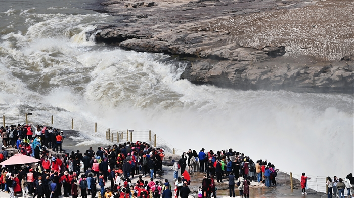 近日,随着黄河上游冰凌消融,位于秦晋峡谷的黄河壶口瀑布水量增大。游人纷纷前来观看“一里壶口十里雷,春水腾雾浪滔天”的壮观景象。新华社发