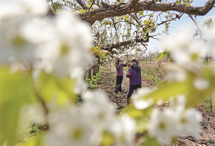 近日,河北省唐山市丰南区梨树陆续开花,果农抢抓农时给梨树进行疏花,提高坐果率和果品品质,促进增产增收。